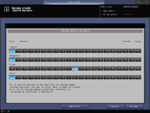 Plage de réglage : -10 (clair) à +10 (foncé) pour toute les couleurs <Jaune>, <Magenta>, <Cyan> et <Noir>