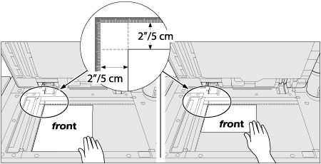 Placez le recto de la mire de réglage vers le haut (détourné de la vitre d'exposition), avec le bord supérieur aligné sur l'arrière de la vitre. Placez le coin supérieur gauche de la mire de réglage à une distance d'environ 2 pouces (5 cm) du guide vertical et du guide horizontal, alignez les bords gauche et supérieur parallèlement au guide vertical et au guide horizontal de la vitre d'exposition.
