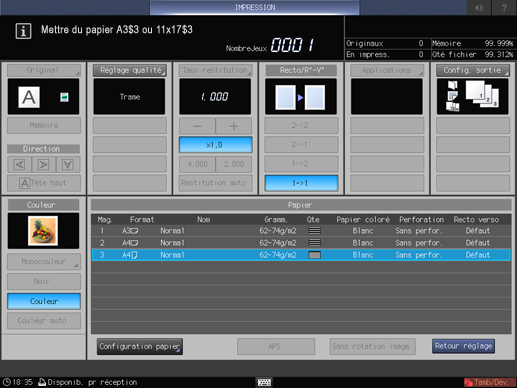 Affichez l'écran [IMPRESSION] de la feuille de fond et appuyez sur la touche Départ du panneau de contrôle. Vérifiez que la sortie est terminée, puis appuyez sur [Retour réglage].
