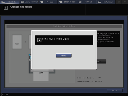Si la valeur de réglage calculée en appuyant sur [Oui] est en dehors de la plage de réglage, le dialogue suivant s'affiche. Appuyez sur [Fermer] pour ignorer les résultats de mesure et relancer la mesure de numérisation depuis le début.