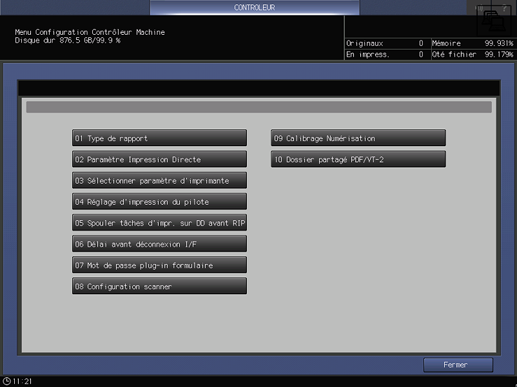 Appuyez sur [Contrôleur] pour afficher l'écran [Menu Configuration Contrôleur Machine]. L'écran [Menu Configuration Contrôleur Machine] permet d'effectuer différents réglages et de vérifier l'état des tâches.