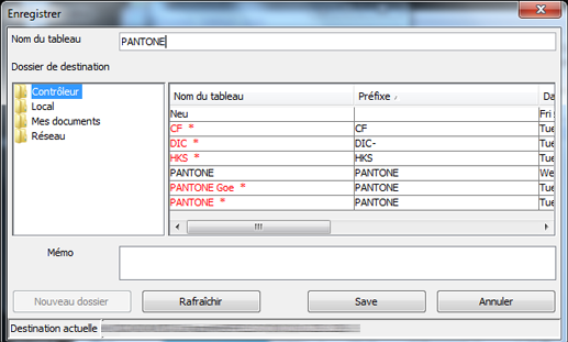 Lorsque vous avez vérifié le nom du tableau de couleurs spot, sélectionnez un [Dossier de destination] et cliquez sur [Enregistrer].
