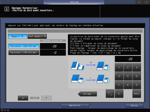 Exemple : rapprochez le bord avant du papier couverture gauche de 2 mm des pages de corps lorsque le format papier des pages de corps est défini sur [Personnel (220-379 mm)].