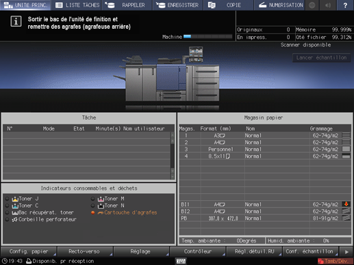 L'indicateur Cartouche d'agrafes dans la zone [Indicateurs consommables et déchets] de l'écran [UNITÉ PRINC.] s'allume en rouge et la couleur du texte devient jaune.