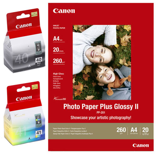 Cartouche Canon PG-40 (noire) + Cartouche Canon CL-41 (couleur) + Canon PP-201 Photo Plus II (Papier photo A4)