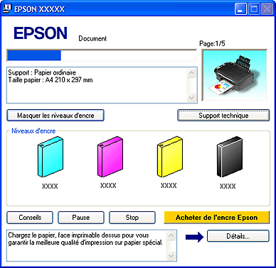 La barre de progression s'affiche automatiquement lors du lancement d'un travail d'impression. Elle vous permet de connaître l'état de la cartouche d’encre. Cliquez sur le bouton Vérifier les niveaux d'encre au niveau de l'écran de la barre de progression pour afficher l'état de la cartouche d'encre comme indiqué ci-dessous.