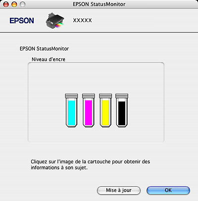 Si l'une des cartouches d'encre installées dans l'imprimante est cassée, incompatible avec le modèle d'imprimante ou incorrectement installée, EPSON StatusMonitor n'affichera pas un état précis de la cartouche d'encre. Veillez à remplacer ou réinstaller toute cartouche d'encre indiquée par EPSON StatusMonitor.