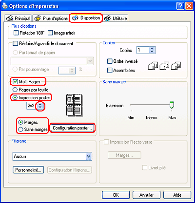 L’impression Poster permet d’imprimer une image à la taille d’un poster en agrandissant le document de façon à couvrir plusieurs feuilles de papier.