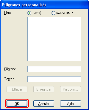 Pour utiliser un fichier d’image comme filigrane, sélectionnez Image BMP. Cliquez sur Parcourir pour localiser le fichier bitmap que vous souhaitez utiliser et cliquez sur OK. Donnez un nom à votre filigrane dans la zone Filigrane, puis cliquez sur Enregistrer.