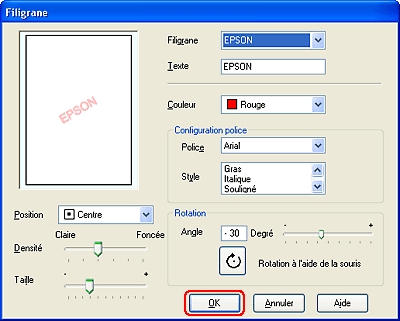 Assurez-vous que le filigrane souhaité est sélectionné dans la liste Filigrane et sélectionnez les paramètres Couleur, Position, Densité, Taille, Police, Style et Angle (pour plus de détails, reportez-vous à l’aide en ligne). Les paramètres définis sont visibles dans la fenêtre d'aperçu.