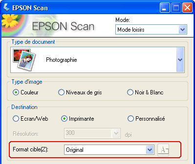 Si vous souhaitez numériser les images au format original ou selon un format plus petit et que vous ne souhaitez pas les agrandir par la suite, vous pouvez accepter le paramètre Résolution sélectionné par Epson Scan en fonction du paramètre Destination défini (Mode loisirs uniquement).