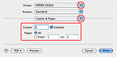 Sélectionnez l'imprimante utilisée pour le paramètre Printer (Imprimante). Définissez ensuite les paramètres Copies & Pages (Copies et pages).