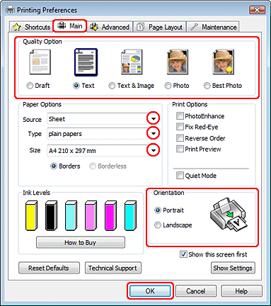 Sélectionnez les paramètres Media Type (Support), Color (Couleur) et Mode adaptés. Pour plus de détails sur l'option Print Settings (Paramètres d'impression), reportez-vous à l'aide en ligne.