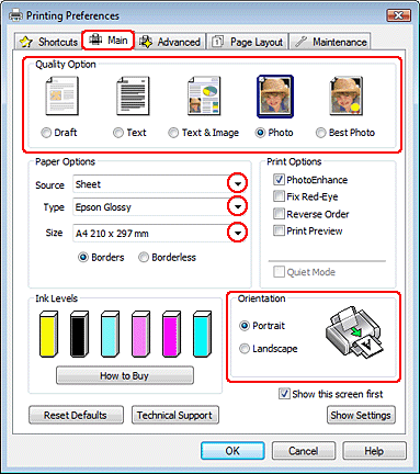 Cliquez sur l’onglet Main (Principal) et sélectionnez un des paramètres Quality Option (Option Qualité) suivants :