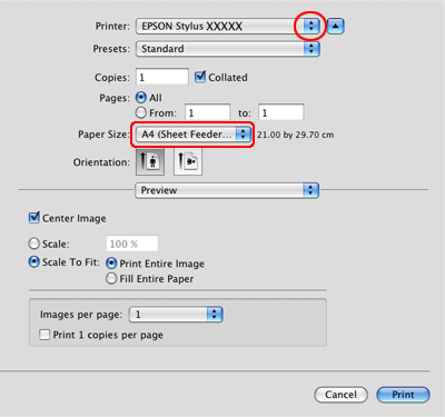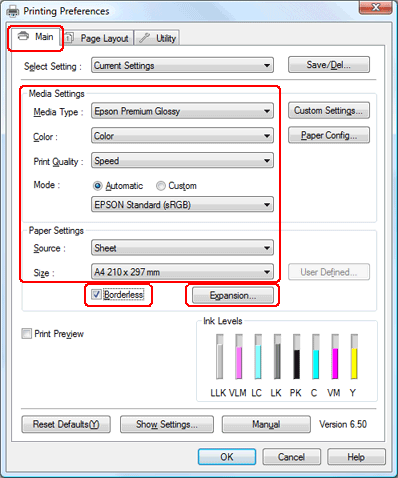 Select the appropriate Paper Size setting. If you want to print borderless photos, select the paper size and borderless printing such as Auto Expand or Retain Size.