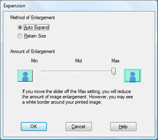 Moving the slider towards Min decreases the amount of the image enlargement; however, as this amount decreases, margins may appear on one or more sides of the paper.