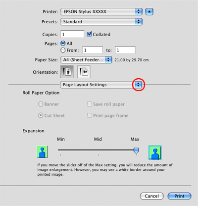 If you select borderless printing, select Page Layout Settings from the pop-up menu, then set the amount of the enlargement.