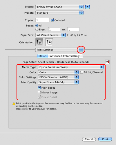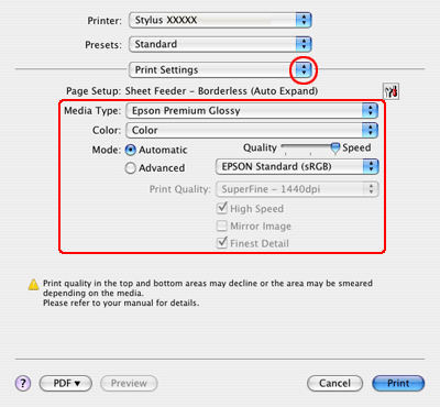 Select the appropriate Media Type, Color, and Mode settings. See online help for details of Print Settings.