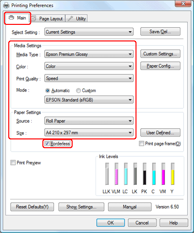 Windows: Roll Paper Mac OS X: Roll Paper, Roll Paper - Borderless