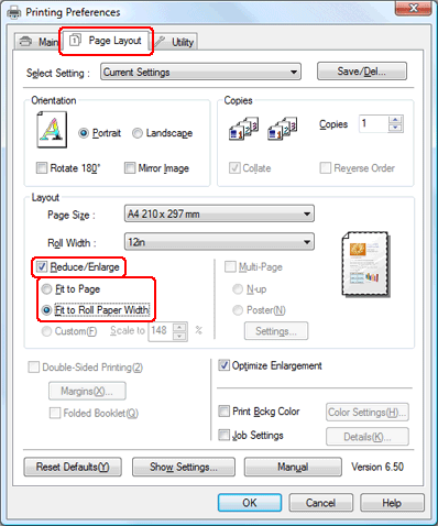 Click the Page Layout tab, and select Reduce/Enlarge, and then select Fit to Page or Fit to Roll Paper Width.