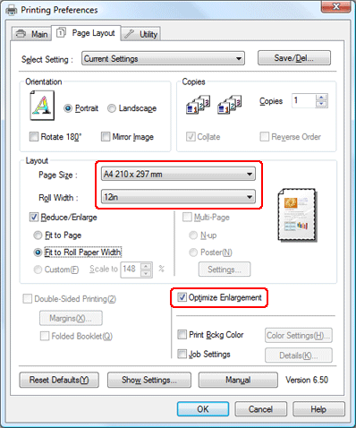 Select the document size created using the application from the Page Size list and select the roll paper width set in the printer for the Roll Width or Output Paper setting.