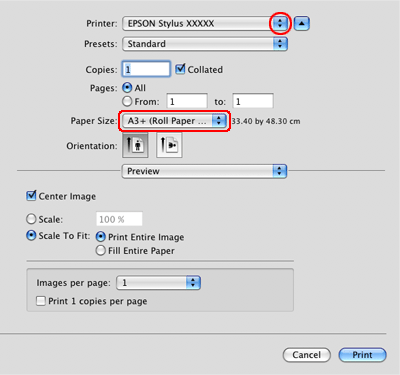 Make sure your printer is selected, and select the appropriate Paper Size.