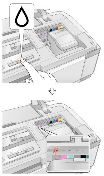 Press the  ink button. The print head moves to the ink cartridge replacement position and the  power light begins to flash. If the ink in the cartridge is low, it is indicated by a flashing ink cartridge light. If the ink cartridge is expended, it is indicated by a lit ink cartridge light.