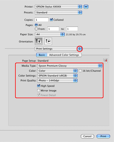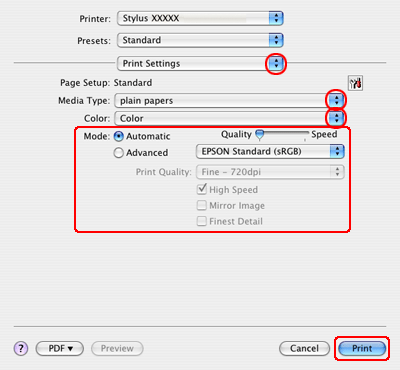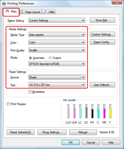 Select the appropriate Media Type, Color, and Mode settings. See the online help for details of Print Settings.