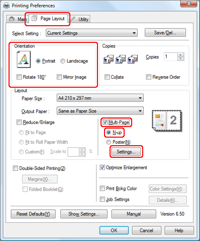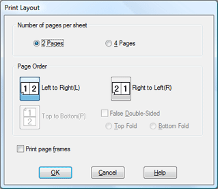 Click Settings to open the Print Layout window. In the Print Layout window, specify the order in which the pages will be printed. To print frames around the pages printed on each sheet, check the Print page frames check box.