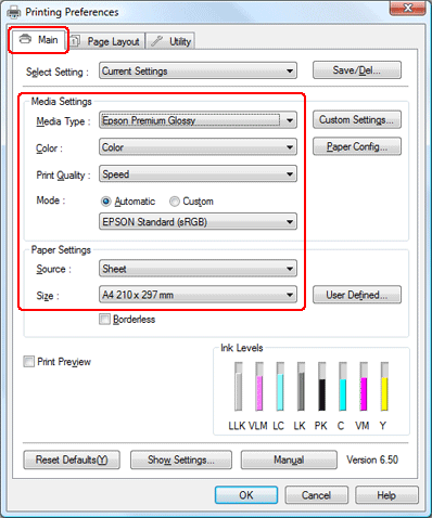 Click the Main tab, select the appropriate Media Type setting, and then select your preferred items for Color, Print Quality, and Mode settings.