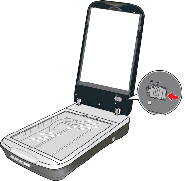 Ouvrez le capot du scanner et faites glisser le verrou de transport du lecteur de transparents en position verrouillée. Fermez ensuite le capot du scanner.