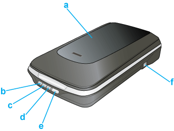 a. Capot du scanner b.  Touche Num. vers PDF c.  Touche Scan to E-mail d.  Touche Copy e.  Touche AutoScan f. Interrupteur