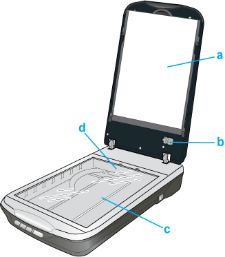 a. Cache pour documents b. Verrou de transport du lecteur de transparents c. Vitre d'exposition d. Chariot