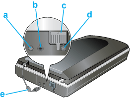 a. Prise CC b. Connecteur de l'interface en option c. Verrou de transport du scanner d. Connecteur de l'interface USB e. Câble du capot