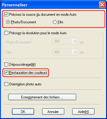 Mode auto : cliquez sur le bouton Personnaliser, activez la case à cocher Précisez la source du document en mode Auto et sélectionnez le type d'original que vous souhaitez numériser (si nécessaire). Activez ensuite la case à cocher Restauration de la couleur et cliquez sur OK. Passez ensuite à l'étape 9.