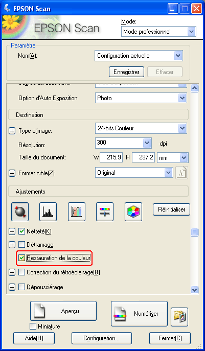 Procédez comme suit pour restaurer les couleurs à l'aide de Epson Scan.