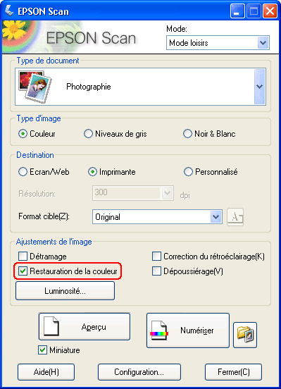 Mode loisirs : activez la case à cocher Restauration de la couleur.