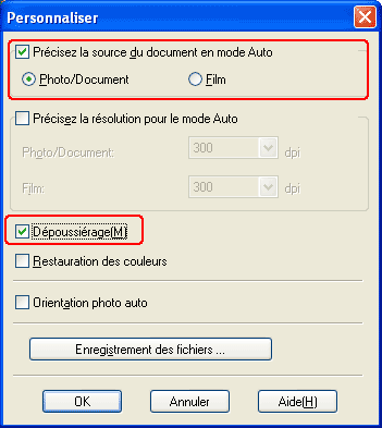 Mode auto : cliquez sur le bouton Personnaliser, activez la case à cocher Précisez la source du document en mode Auto et sélectionnez le type d'original (si nécessaire). Activez ensuite la case à cocher Dépoussiérage et cliquez sur OK. Passez ensuite à l'étape 9.