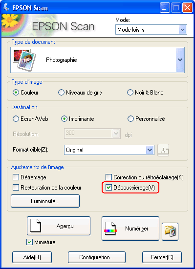 Suppression des traces de poussièreLa fonction Dépoussiérage de Epson Scan vous permet de supprimer virtuellement les traces de poussière présentes sur les originaux lors de la numérisation.