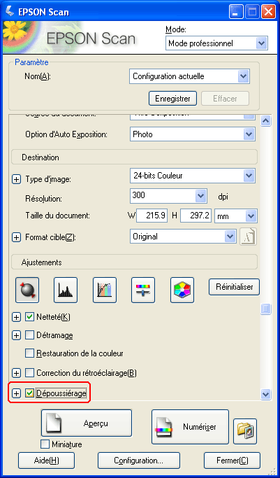 Procédez comme suit pour supprimer les traces de poussière à l'aide de Epson Scan.