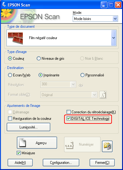 Procédez comme suit pour supprimer les traces de rayures ou de poussière présentes sur les films ou les diapositives à l'aide du Mode loisirs ou du Mode Professionnel de EPSON Scan :