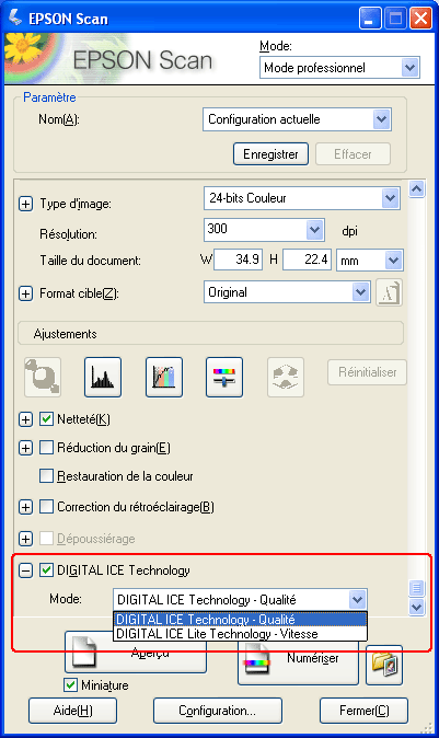 Digital ICE Technology peut supprimer les traces de poussière que la fonction Dépoussiérage n'a pu ôter. La numérisation à l'aide de la fonction Digital ICE Technology prend néanmoins plus de temps et nécessite davantage de ressources du système. Nous vous recommandons d'essayer de supprimer les traces de poussière à l'aide de la fonction Dépoussiérage avant d'utiliser la fonction Digital ICE Technology. Pour plus de détails, reportez-vous à la section
