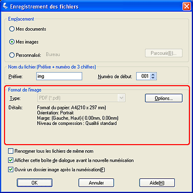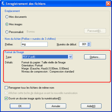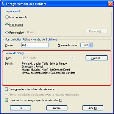 Sélectionnez les paramètres adaptés à votre document et cliquez sur OK. La fenêtre Enregistrement des fichiers apparaît de nouveau.