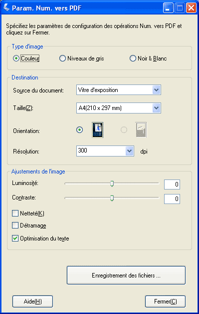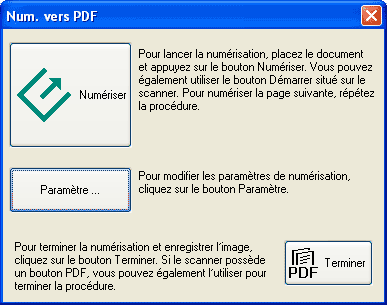 Appuyez sur la touche Scan to PDF  du scanner. La fenêtre Num. vers PDF apparaît.