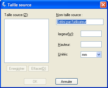 Si vous souhaitez sélectionner une taille qui ne figure pas dans la liste Taille, vous pouvez créer une taille personnalisée. Cliquez sur la flèche de la liste Taille et sélectionnez Personnaliser. La fenêtre Taille source apparaît.