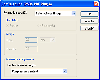Si vous devez modifier un des paramètres PDF définis, cliquez sur le bouton Options. La fenêtre Configuration Epson PDF Plug-in apparaît.