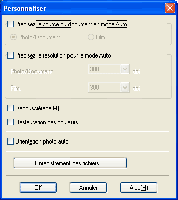 Sélectionnez cette option si vous souhaitez que la fenêtre Enregistrement des fichiers apparaisse automatiquement avant la numérisation (Mode loisirs ou Mode Professionnel uniquement). Si cette option n'est pas activée, vous devez cliquer sur le bouton Enregistrement des fichiers pour ouvrir la fenêtre correspondante en Mode loisirs ou en Mode Professionnel.