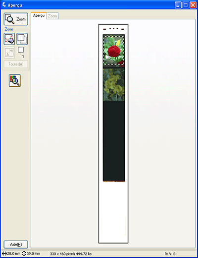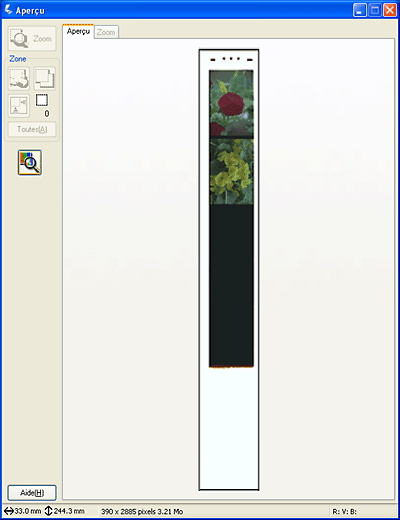 Pour procéder à un zoom avant dans une image, cliquez à l'intérieur de la zone de numérisation et cliquez sur le bouton Zoom. Epson Scan procède de nouveau à la prénumérisation et affiche un aperçu plus grand au niveau de l'onglet Zoom (les autres images sont toujours affichées en aperçu au format original au niveau de l'onglet Aperçu).