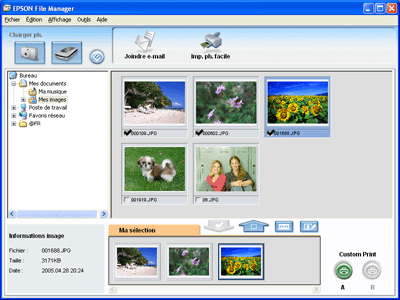en Mode loisirs ou Mode Professionnel, la fenêtre Enregistrement des fichiers apparaît. Cette fenêtre vous permet de sélectionner le nom et l'emplacement des fichiers de numérisation enregistrés. Pour plus de détails, reportez-vous à la section Sélection des paramètres d'Enregistrement des fichiers. Une fois la numérisation terminée, les miniatures des images numérisées s'affichent dans la fenêtre de Epson File Manager.Si vous souhaitez utiliser les images numérisées dans un des programmes de projets de Epson Creativity Suite, activez la case à cocher située sous les miniatures des images. Les images s'affichent dans la zone Ma sélection située au bas de la fenêtre Epson File Manager.