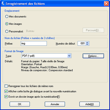 Si vous avez lancé la numérisation en exécutant Epson Scan en tant que programme autonome (en Mode loisirs ou en Mode Professionnel), la fenêtre Enregistrement des fichiers s'affiche. Cette fenêtre vous permet de sélectionner le nom et l'emplacement des fichiers de numérisation enregistrés. Pour plus de détails, reportez-vous à la section Sélection des paramètres d'Enregistrement des fichiers.